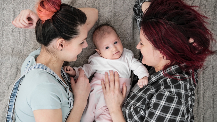 Two young women in casual clothes and with pink hair, a lesbian homosexual couple, lying on a rug with a child. Same-sex marriage, adoption.